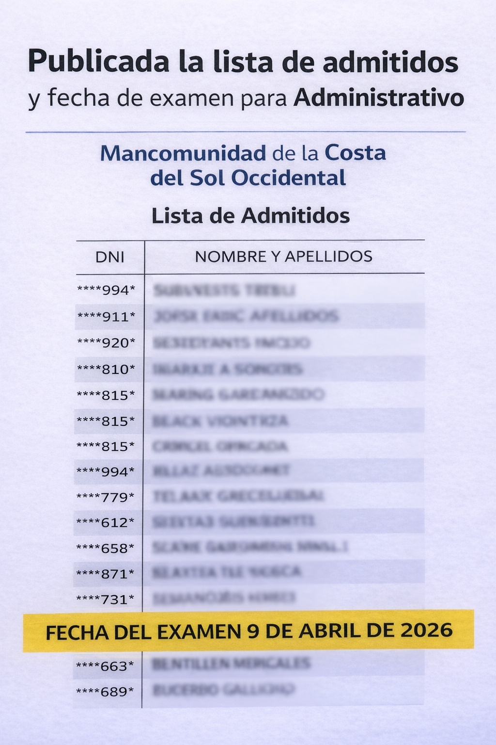 Lista definitiva de admitidos y fecha de examen para Administrativo en la Mancomunidad de la Costa del Sol Occidental
