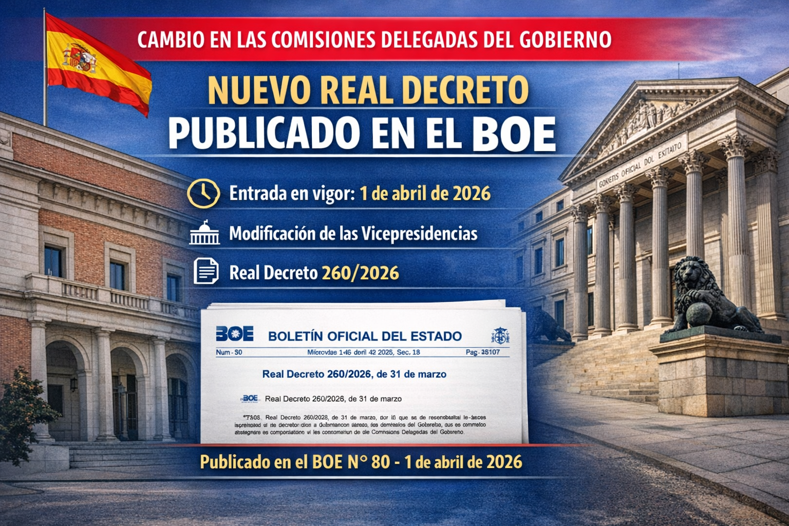 El Boletín Oficial del Estado (BOE) ha publicado en su número 80, de 1 de abril de 2026, el Real Decreto 260/2026, de 31 de marzo, que introduce cambios en la composición de las Comisiones Delegadas del Gobierno.