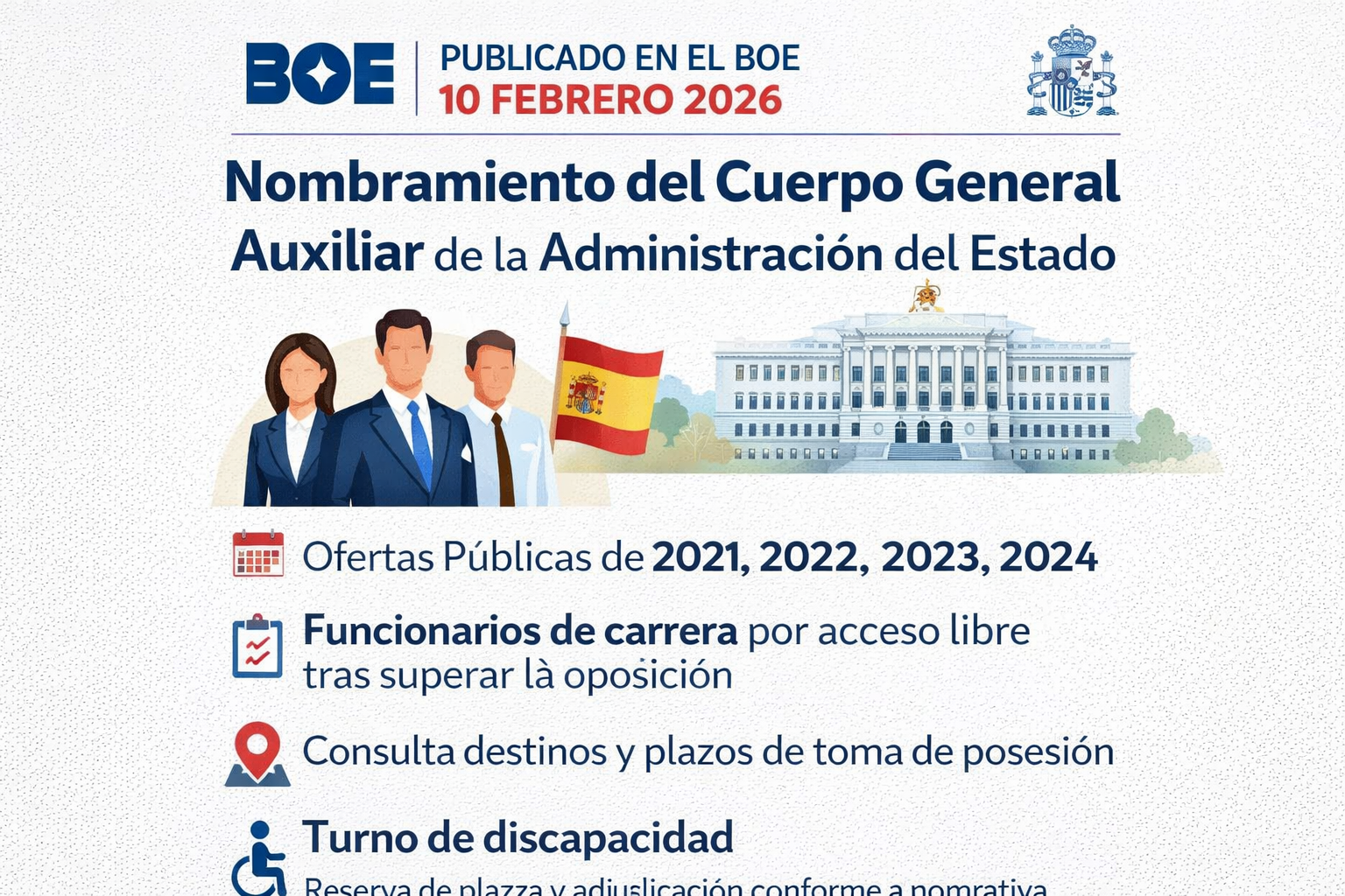 El Boletín Oficial del Estado (BOE) de martes 10 de febrero de 2026, número 36, publica la Resolución de 5 de febrero de 2026 de la Secretaría de Estado de Función Pública, por la que se realiza el Nombramiento de funcionarios del Cuerpo General Auxiliar de la Administración del Estado
